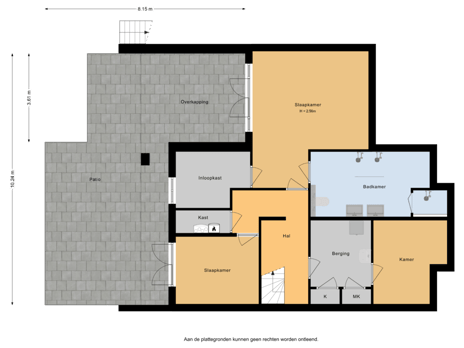 Hal, technische ruimte, berging en provisieruimte, werk/studeerkamer met deur naar het verdiepte terras, grote slaapkamer met inloopkast. Ook vanaf de slaapkamer zijn er openslaande deuren naar het besloten terras. Deze plek is uitstekend geschikt voor het plaatsen van sauna of jacuzzi.