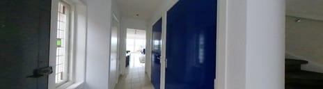 Via de hal bereik je de L-vormige woonkamer, keuken, badkamer, het separate toilet, de meterkast en de trap naar boven. In de hal zijn nog de originele glas-in-loodramen behouden gebleven, terwijl op de gehele begane grond fraaie Portugese vloertegels liggen.