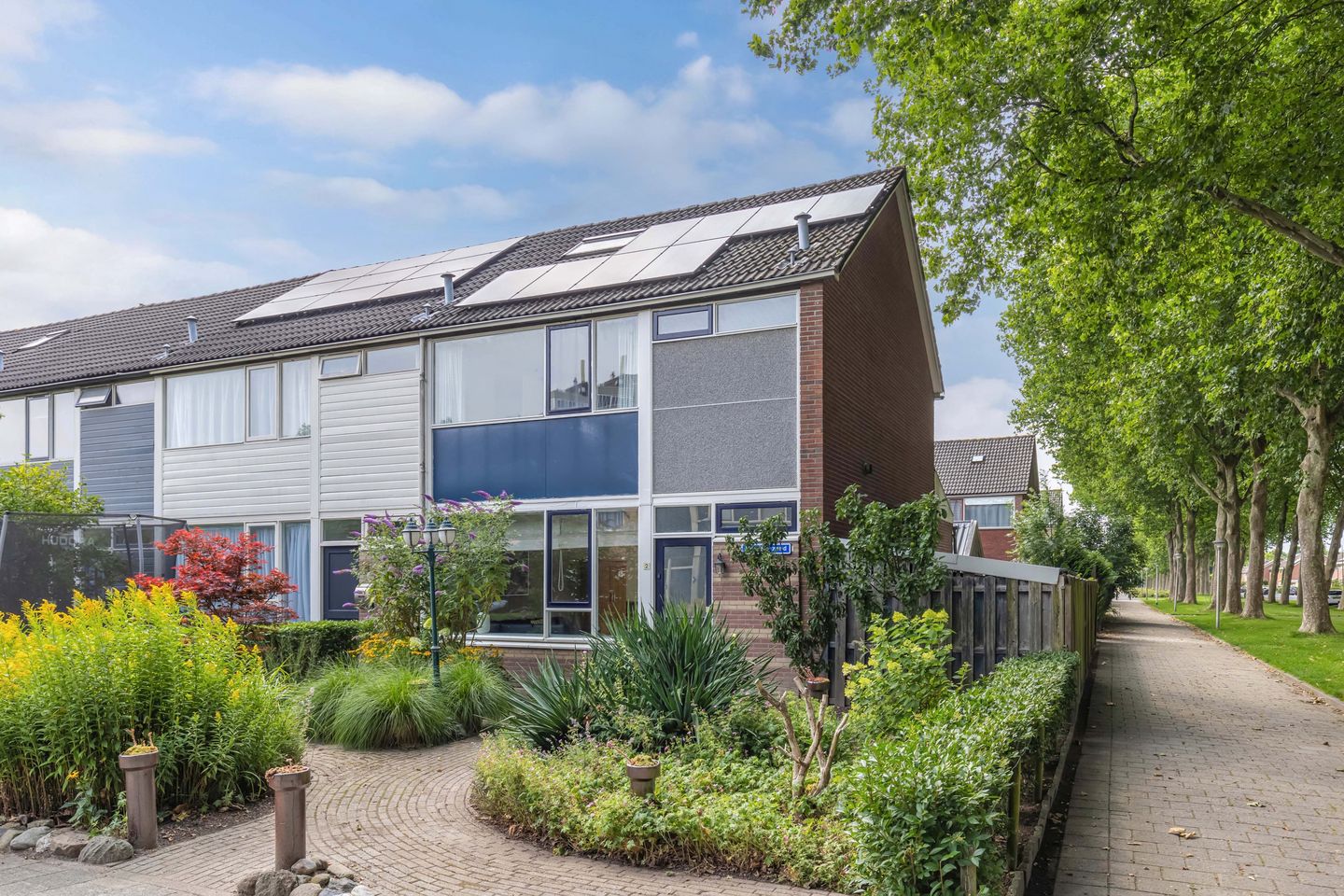 De besloten achtertuin op het westen biedt veel privacy en heeft een achterom. Achterin staat een vrijstaande houten berging. Aan de voorzijde ligt een nette voortuin. Aan de zijkant van de woning is een breed wandelpad met groen met veel bomen.
