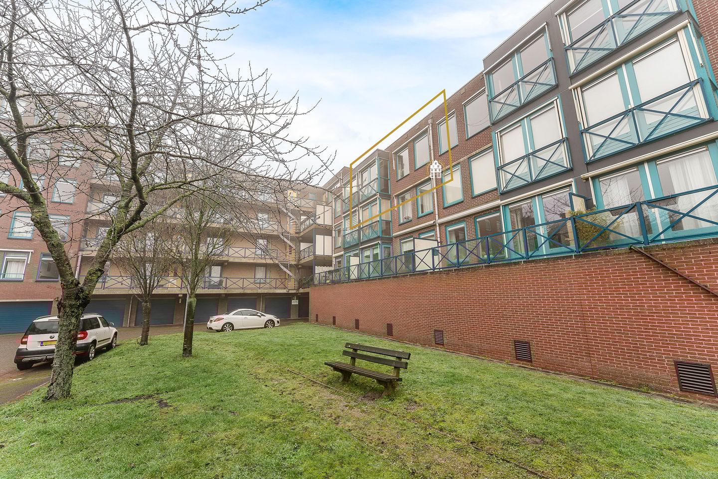 De lichte woonkamer, voorzien van grote raampartijen en een Frans balkon op het westen, kent een verzorgd interieur en biedt een rijk uitzicht op de gezamenlijke binnentuin en het centrum van de stad. Het driekamerappartement beschikt over twee goede slaapkamers plus een separate wasruimte, waarmee het woonoppervlak en de praktische, overzichtelijke indeling beantwoorden aan een meer dan comfortabele woonbeleving.