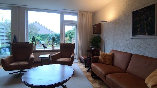 Entrance hall with meter cupboard and access to the stone storage room with a practical storage loft. From the hall you enter the spacious and bright living room. Large windows provide plenty of natural light and there is ample space for a generous seating area with a pleasant view of the garden. The garden is directly accessible through the back door, ideal on sunny days.