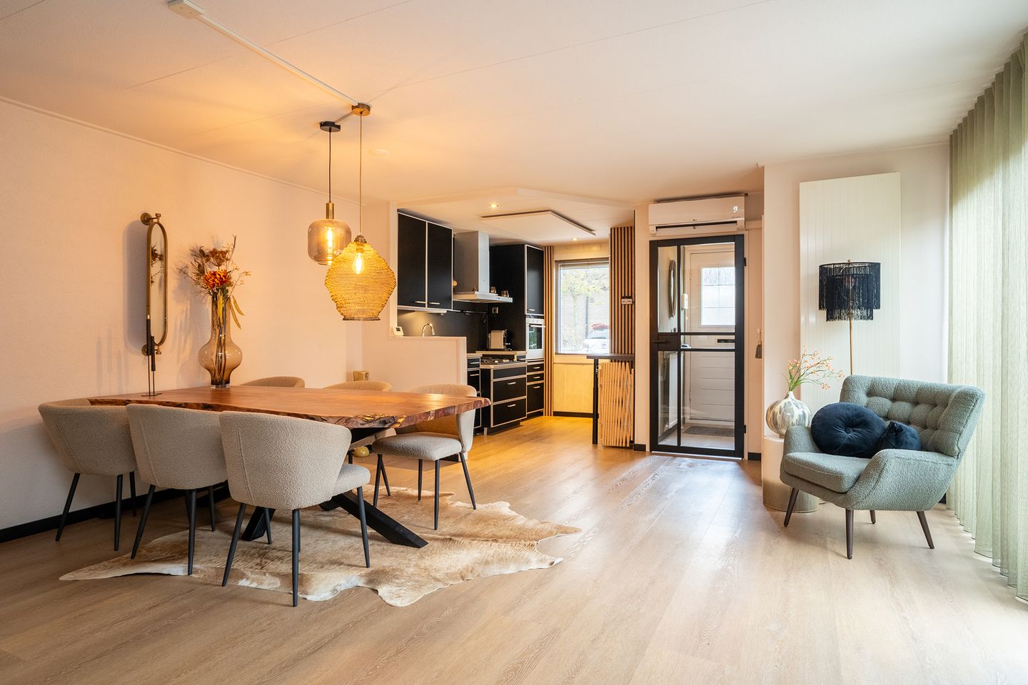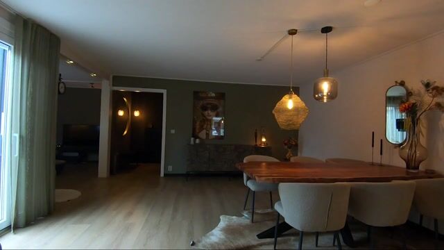 The open layout creates a pleasant connection between the kitchen and the dining area, making it a wonderful place to gather. The abundance of natural light and the warm flooring contribute to the inviting atmosphere. Large sliding doors bring in plenty of daylight and offer direct access to the garden.