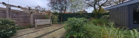 De tuin rondom de woning is leuk ingedeeld met terrassen en borders. Langs de aangebouwde garage kun je naar de voorzijde van het huis. Vóór deze garage heb je voldoende parkeergelegenheid en de voortuin is in de zelfde stijl als de rest van de tuin. Het perceel van 308 m2 geeft veel ruimte en privacy.