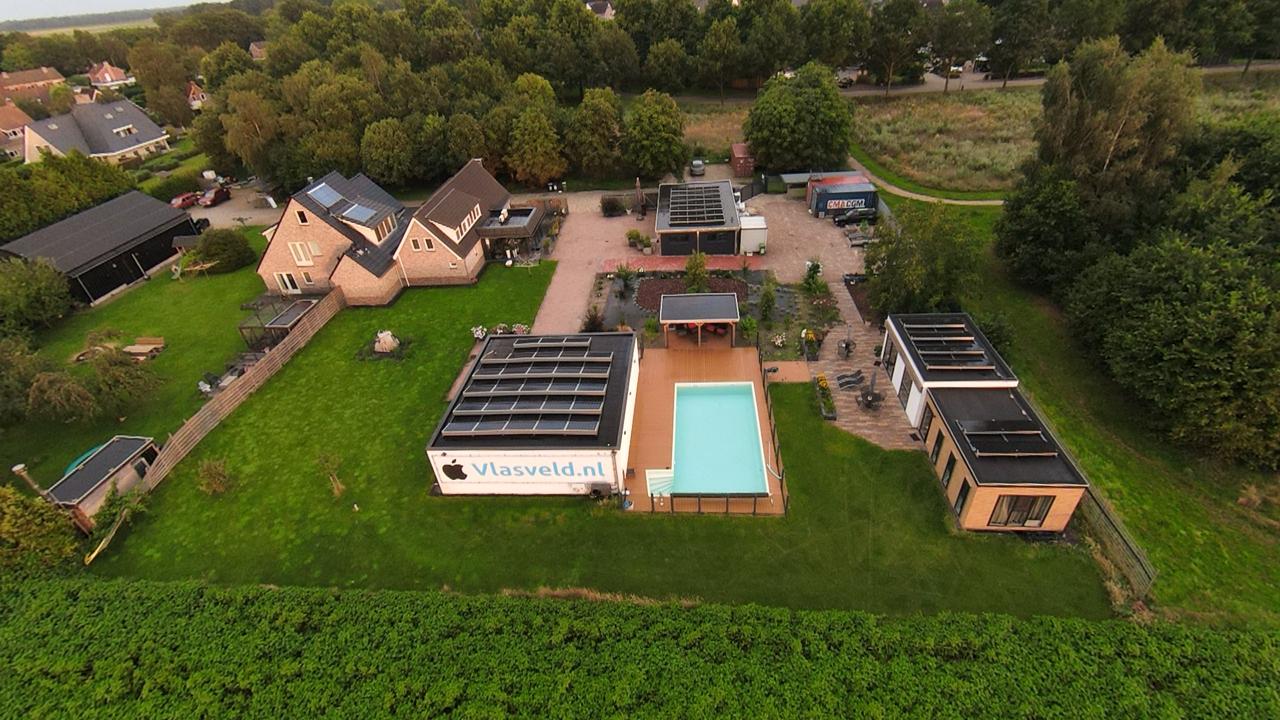 Tuin en bijgebouwen: deze woning biedt een keurige ruime tuin met onder andere fruitbomen, borders, gazon, genietend van een prachtig vrij uitzicht over de landerijen en zijn voorzien van 2 elektrische poorten, een dubbele carport met zonnepanelen, een openluchtzwembad met vlonder en pergola, alsmede een houten Douglas overkapping. Op het terrein bevind zich tevens een compleet nieuw ingerichte mantelzorgwoning (2024) met airco, keuken met apparatuur, woonkamer, twee slaapkamers en een badkamer. Daarnaast staat op het perceel een grote loods met inpandig kantoor-winkelgedeelte, voorzien van airco en alarminstallatie. Tenslotte is er een extra gastenverblijf/praktijk/kantoorruimte gerealiseerd met douche en keukenblok voorzieningen.