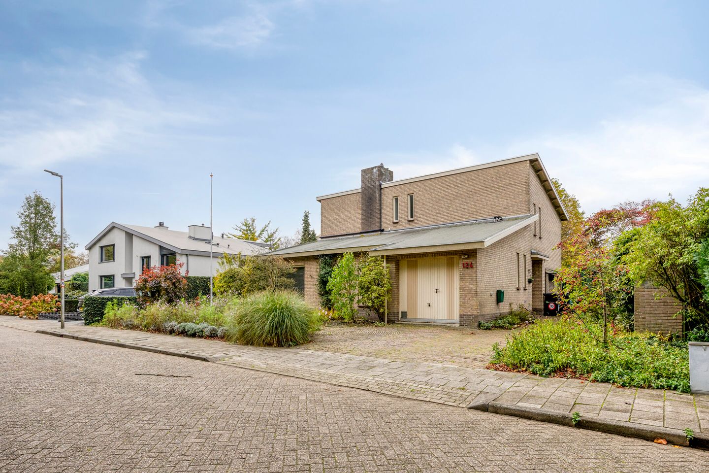 Je komt aan via de brede oprit met sierbestrating, waar je meerdere auto’s kunt parkeren. De voortuin is aangelegd met vaste planten, sierbestrating en een handige buitenkraan. Vanuit de oprit heb je toegang tot de garage en via de zijtuin bereik je de overdekte entree.