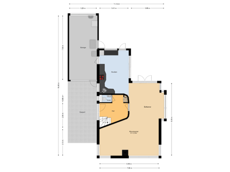 Aan de achterzijde ligt de keuken. Deze is praktisch opgezet met veel kastruimte en lades, en compleet uitgerust met een oven, koelkast, 4-pits inductiekookplaat, afzuigkap, spoelbak met elektrische boiler en vaatwasser. Door de loopdeur heb je eenvoudig toegang tot de achtertuin en de garage.