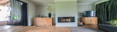 On the garden side, there are two sets of double garden doors and a large glass facade, offering beautiful views of the garden and the meadow/nature reserve beyond. A modern gas fireplace is built into the wall between the kitchen and garden.