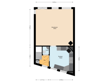 Ruime, semi-open keuken in U-opstelling, ± 13 m², voorzien van tegelvloer, diverse onder- en bovenkasten en inbouwapparatuur, t.w. inductiekookplaat, afzuigschouw, oven, vaatwasser, koelkast en vriezer.