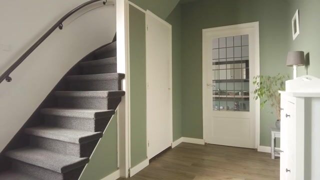 U komt binnen in een ruimte hal voorzien van pvc-vloer met vloerverwarming, vernieuwde meterkast (met glasvezel), garderoberuimte en houten trapopgang naar de eerste verdieping.
