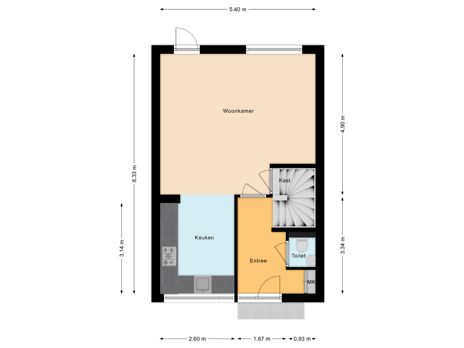 De keuken staat in open verbinding met de kamer en er is een praktische provisieruimte gesitueerd onder de trap.