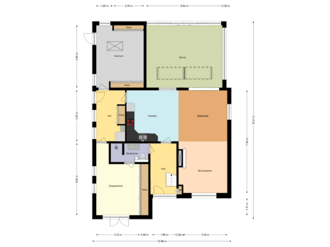 De keuken is praktisch ingericht en voorzien van voldoende kast- en werkruimte. De U-opstelling werkt prettig en overzichtelijk. Je loopt vanuit de keuken eenvoudig naar zowel de serre als de aangrenzende hal.