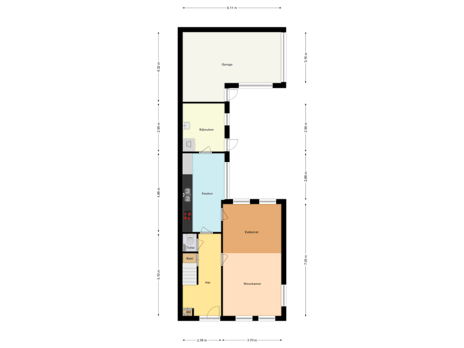 Bij binnenkomst in de woonkamer valt direct de lengte en het licht op. De grote ramen aan beide zijden zorgen voor een prettige daglichtinval en een ruimtelijk gevoel. Aan de voorzijde is ruimte voor een gezellige zithoek, terwijl het eetgedeelte aan de tuinzijde is gesitueerd. Een fijne plek voor lange avonden tafelen. Via het eetgedeelte bereik je de dichte keuken aan de achterzijde. Deze keuken beschikt over volop kast- en werkruimte en biedt een mooie basis om geheel naar eigen smaak te moderniseren. Aansluitend aan de keuken bevindt zich de bijkeuken, een praktische ruimte met wasmachineaansluiting, wastafel en extra opbergmogelijkheden. Vanuit de bijkeuken stap je zo de achtertuin in.