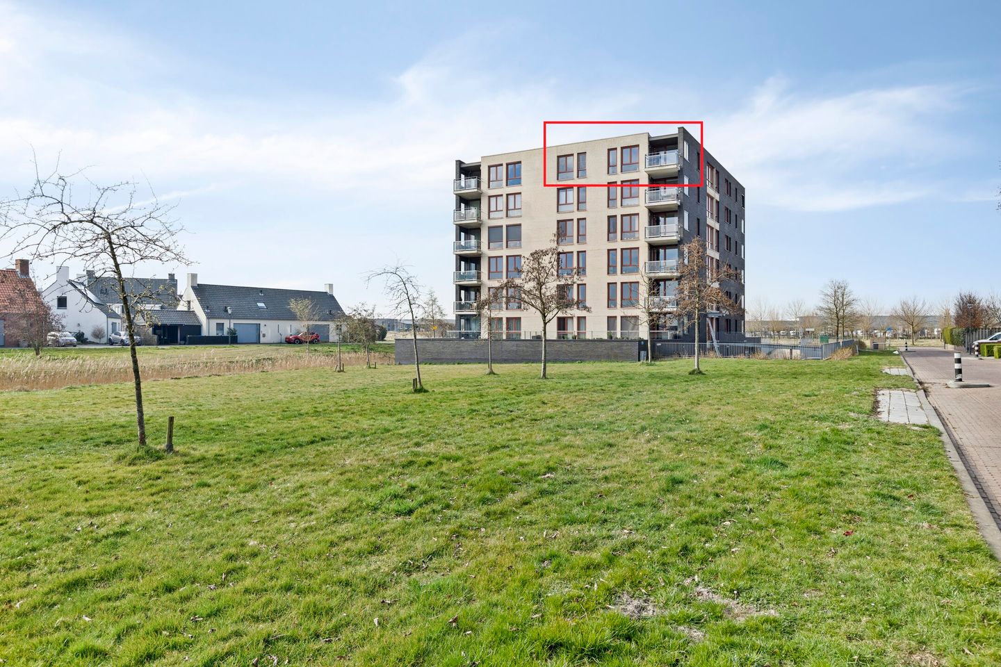 De entree van het appartementengebouw is toegankelijk via een loopbrug met een (rolstoelvriendelijke) helling of via de parkeerkelder. Met de lift of de trap bereikt u de bovenste etage, waar het appartement zich bevindt. De voordeur opent naar een ruime hal, die toegang biedt tot alle vertrekken.