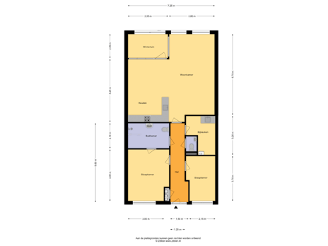 Indeling: hal, toilet, 2 slaapkamers (± 8 en 14 m²), bijkeuken (± 6 m²), badkamer (± 7 m²), woonkamer met open keuken (± 44 m²), tuinkamer met schuifdeur (± 7 m²) en afgesloten berging op begane grond (± 5 m²).