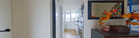 On the other side of the apartment, you will find the kitchen and bathroom. The kitchen is cleverly designed and feels extra spacious due to the access to the second balcony. It is equipped with a sink, extractor hood, dishwasher, fridge-freezer combination, oven, electric built-in hob, and plenty of cupboard space.