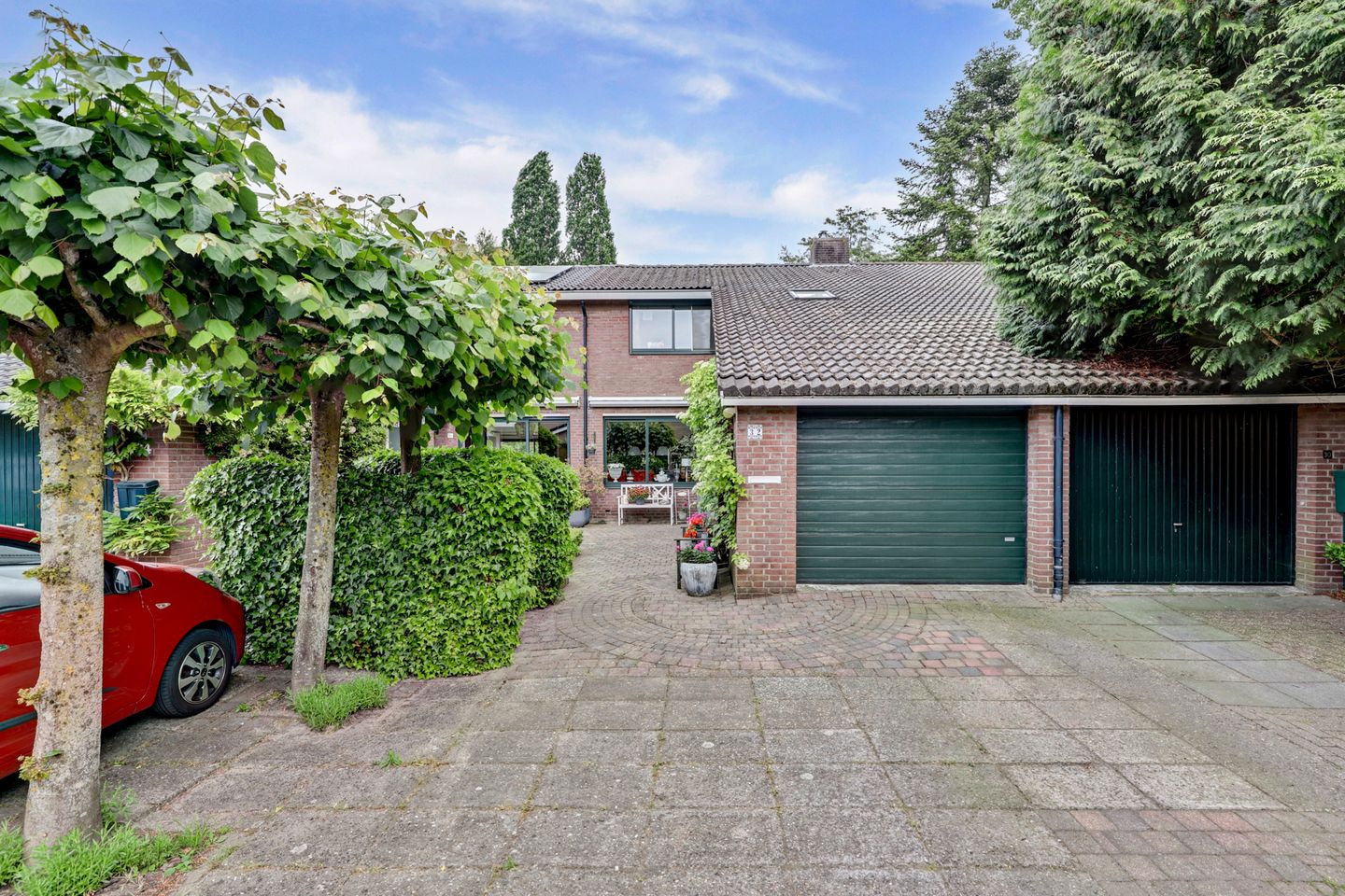 At the front, there is private parking for two cars on the driveway. The house is located on a cul-de-sac, ensuring minimal traffic and a quiet living environment.