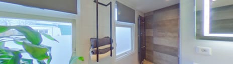- Double sink, walk-in shower, bath, and toilet