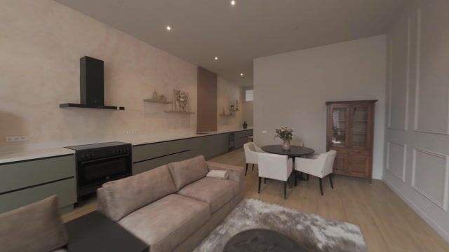 Via het rustige binnenterrein kom je binnen in de hal van het appartement, met toegang tot het wandcloset, de technische ruimte en de woonkamer. De keuken vormt het centrale pronkpunt van de woning. Het royale aanrechtblad loopt over de volledige diepte van de woonkamer en is uitgevoerd met een Quooker, inductiekookplaat met grote oven, losse koel vriescombinatie, een wijnklimaatkast en een vaatwasser. Een elegante en functionele opstelling die perfect past bij deze bijzondere locatie.