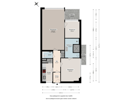 Vanuit de entree/gang toegang tot modern (wand-)toilet met fonteintje, meterkast en royale lichte woonkamer (ca. 26 m²). Vanuit de woonkamer toegang tot balkon op het zuidenwesten ca. 4 m² en eerste slaapkamer van ca. 7 m². Vanuit de entree/gang weer toegang tot de gesloten keuken voorzien van een inbouwkeuken van ca. 5 m², bergkast en cv-ketel. Vanuit entree/gang toegang tot de tweede slaapkamer (ca. 13 m²). Vanuit de tweede slaapkamer toegang tot gemoderniseerde badkamer met inloopdouche en wastafel en tweede balkon van ca. 3 m².