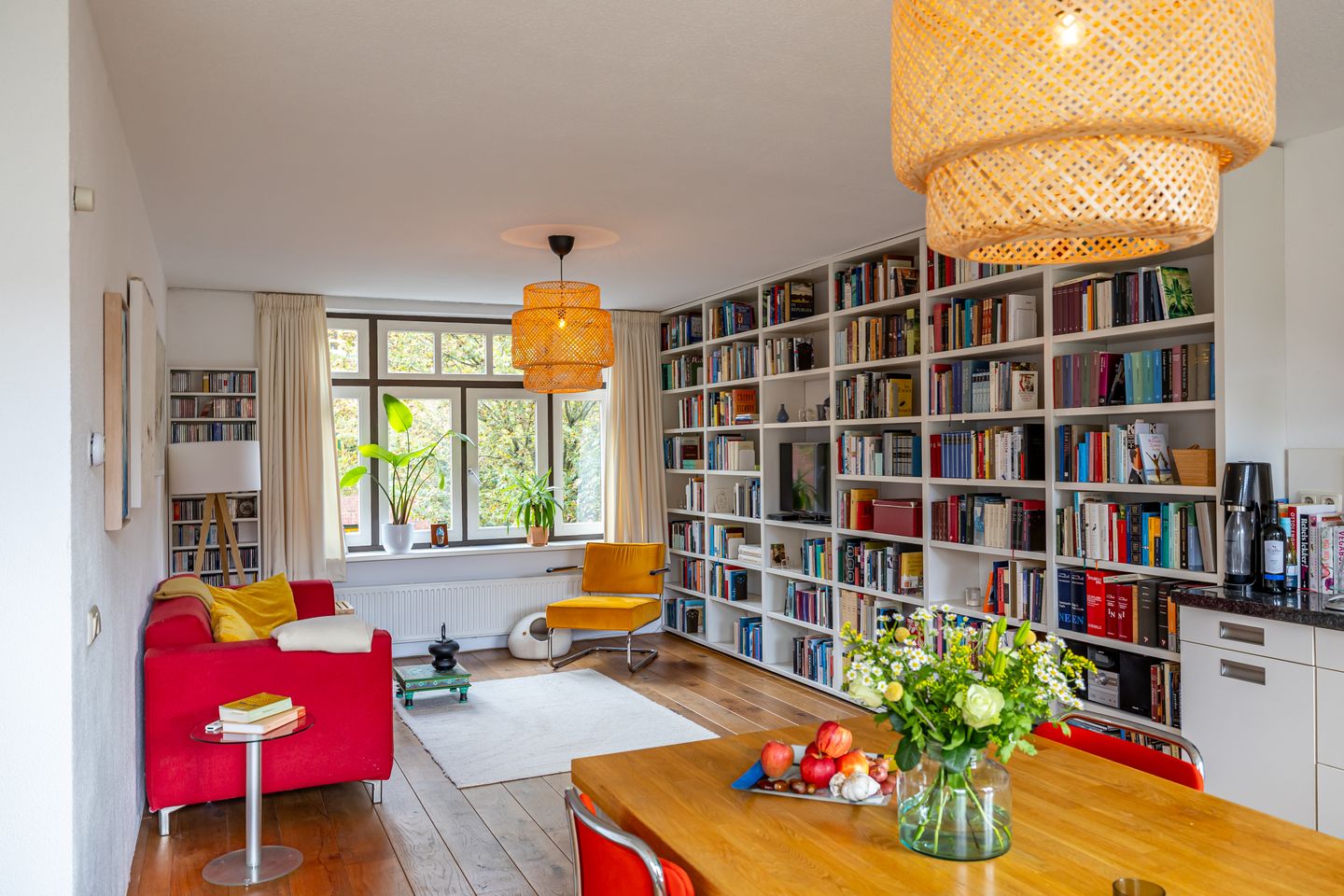 Binnen straalt de woning dezelfde fijne sfeer uit. Op de begane grond vind je de entree met gang, toilet en een handig hoekje voor jassen. Via openslaande deuren kom je in de knusse, groene stadstuin met volop privacy. Een heerlijke plek voor de ochtendkoffie of een rustige zomerse avond. De lichte woonkamer bevindt zich op de eerste verdieping. Deze sfeervolle ruimte met houten vloer en ingebouwde boekenkast loopt door naar de open keuken wat een fijne plek is om te koken, te lezen of met vrienden aan tafel te zitten.
