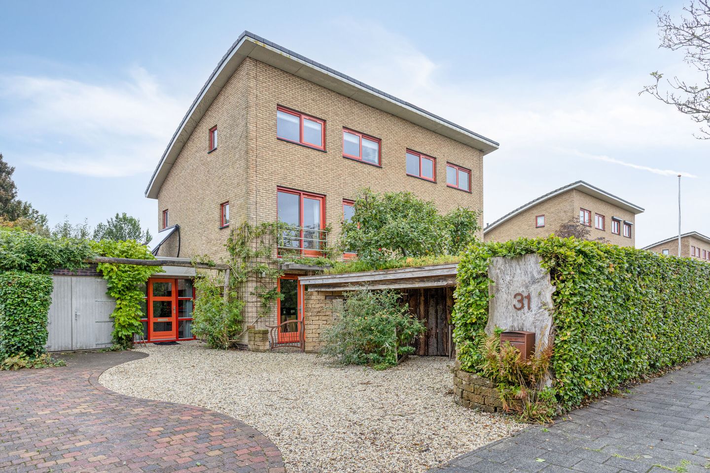 De groene, zonnige achtertuin op het westen biedt volop privacy en is fraai aangelegd met leistenen natuurtegels, een gezellig terras en een overkapping — perfect om tot laat in de avond buiten te zitten.