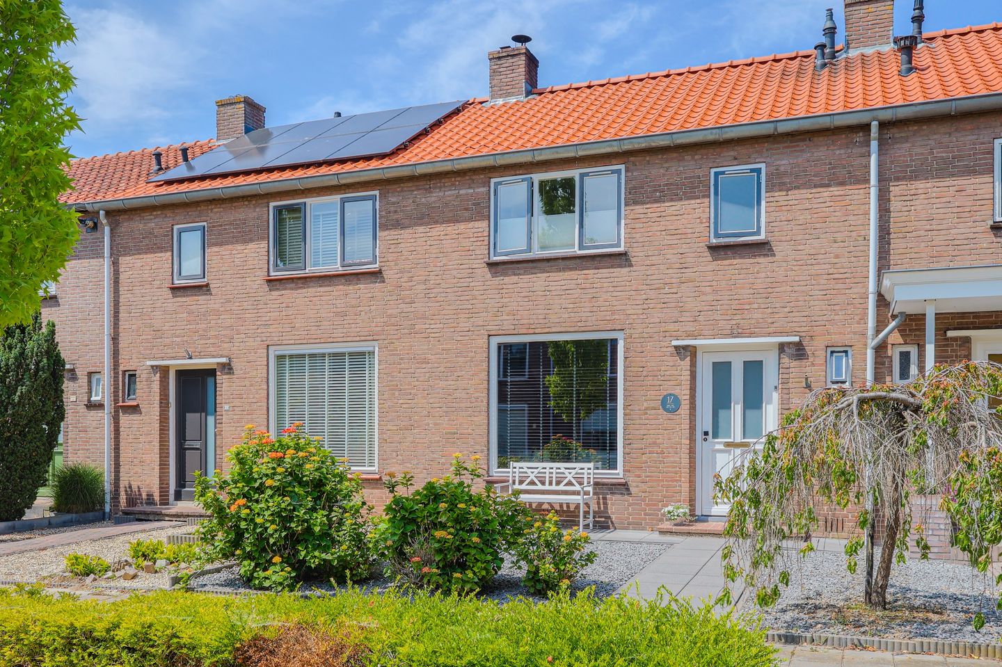 De voortuin is netjes aangelegd met een centraal looppad naar de voordeur. Aan weerszijden van het pad zijn grindborders aangebracht, afgewisseld met kleurrijke en verzorgde beplanting.