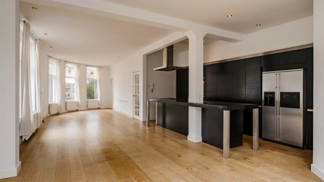 De royale woonkamer met grote raampartijen en authentiek glas-in-lood zorgt voor een prachtige lichtinval en een vrij uitzicht over het park, de straat en het stationsgebied. De moderne open keuken met groot kookeiland vormt samen met de living het hart van het appartement. Via de harmonicadeuren stap je zo het ruime terras op, waardoor binnen en buiten op een natuurlijke manier in elkaar overlopen.