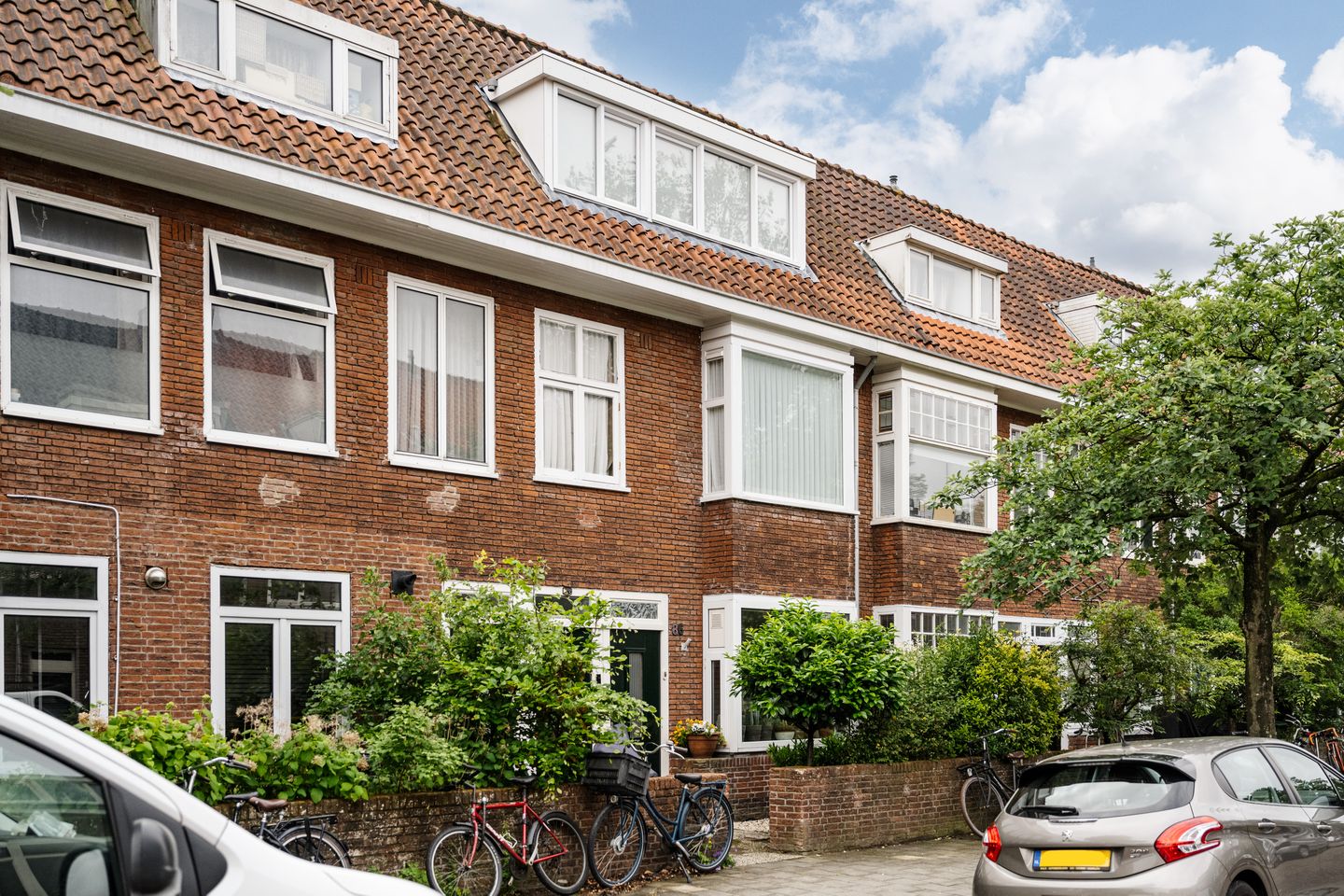 Upon entering you step into the entrance hall, where you immediately notice the authentic charm of the home. Original details such as the classic wall tiles, the draft porch with cut glass, panel doors, marble fireplaces and a characteristic bay window at the front. From the hall there is access to the spacious, bright living room with adjacent dining room. Thanks to the many windows, the bay window at the front and the doors to the garden at the rear, the entire living space is wonderfully light and spacious. The oak parquet flooring and en-suite with built-in cupboards add to the warm, homely atmosphere. Adjacent to the dining room is the open kitchen, which is equipped with various appliances, including a Miele dishwasher (2019) and a Quooker. Through the hall you reach the separate toilet with washing machine connection and the compact but practical bathroom, equipped with a shower and a washbasin. The house has two bedrooms: a spacious master bedroom with French doors to the garden, and a second, slightly smaller room with a large window.
