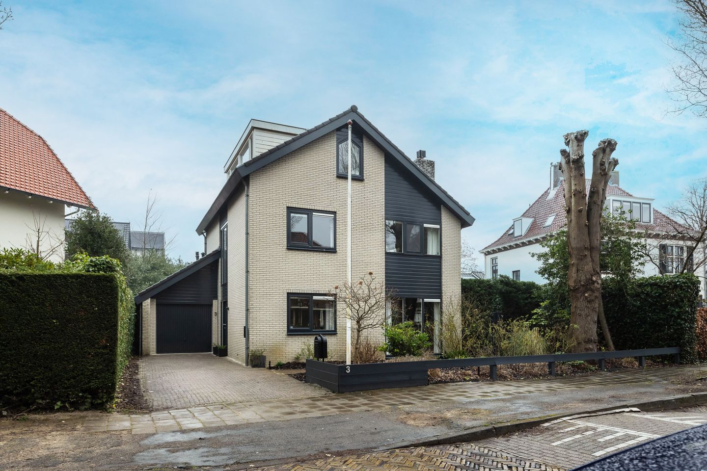The beautifully landscaped front garden with a private driveway offers space for two to three cars; there is also a charging station. Additionally, you can park a (small) car in the garage.
