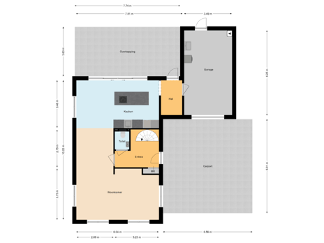 Via de grindoprit met carport bereik je de overdekte voordeur van deze mooie nieuwbouwwoning. Achter de voordeur bevindt zich een entreehal met meterkast, de trap naar de eerste verdieping en een luxe toiletruimte met zwevend toilet en fonteintje. De hal biedt verder toegang tot de woonkamer.