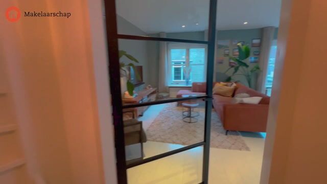 Hal met de toiletruimte, trapopgang naar de 2e verdieping en een garderobekast. Vanuit de hal is er via een stijlvolle industriële deur toegang tot de woonkamer en de keuken. De ruime woonkamer is voorzien van airconditioning en meerdere raampartijen, die zorgen voor een prettige lichtinval. De keuken is uitgevoerd in een lichte kleurstelling en beschikt over voldoende werk-/en bergruimte. De inbouwkeuken is voorzien van de volgende apparatuur; vaatwasser, oven, 5-pits gaskookplaat, afzuigkap en een magnetron.