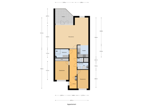 Entree, lange hal met meterkast en van hieruit heeft u toegang tot alle vertrekken in de woning. Aan weerszijden zijn de twee slaapkamers opgesteld, waarvan één beschikt over een kastenwand met schuifdeuren. De badkamer is fraai betegeld en uitgerust met een douchecabine, breed wastafelmeubel met lades, grote kolomkast en een handdoekradiator.