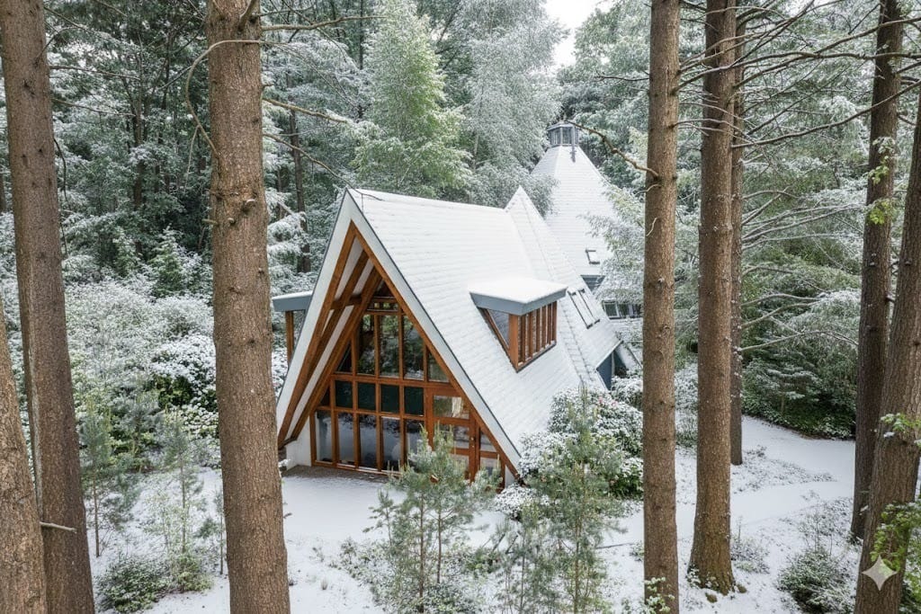 Via de voordeur komt u binnen in dit bijzondere, piramidevormige huis. De woning ademt direct sfeer dankzij de robuuste houten balken die doorlopen over de gehele begane grond. De vloer is afgewerkt met grote lichtgrijze tegels, wat een rustige en stijlvolle basis vormt. In de hal vindt u het toilet met fonteintje, verlicht door een dakraam dat bijzonder zicht geeft op de boomkruinen en extra daglicht binnenlaat. Ook bevindt zich hier een praktische berging met aansluitingen voor de wasmachine, evenals de meterkast.