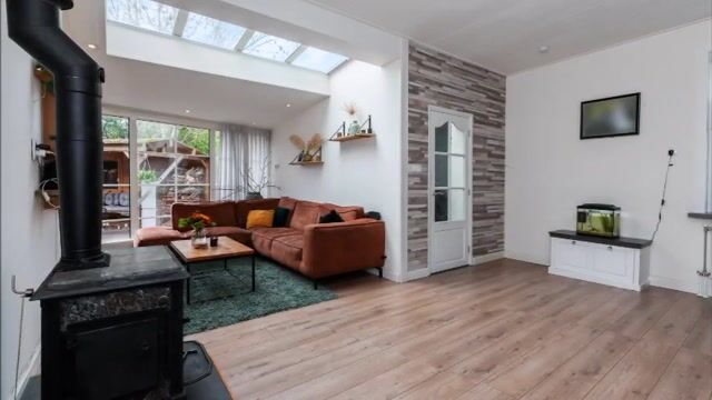 Knus, warm en huiselijk! Dat zijn kenmerken die hier thuis horen. Deze sfeervolle woonkamer is een heerlijke plek om te ontspannen, met veel lichtinval dankzijde de lichtstraat in het plafond. De stijlvolle kastenwand zorgt voor extra opbergruimte en het knapperde vuur in de houtkachel geeft veel warmte in de koude wintermaanden. Via een schuifdeur komt u in de woonkeuken.