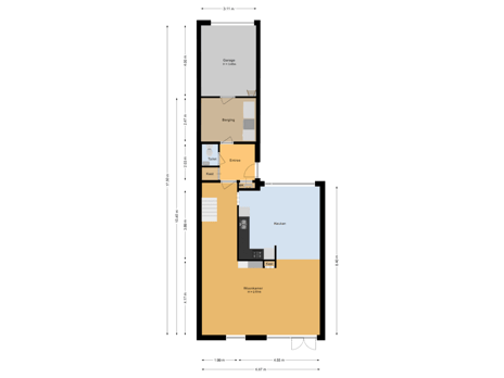 Entree/hal, toilet met fonteintje, bergkast, woonkamer met trapopgang en open haard, nette open keuken voorzien van diverse inbouwapparatuur. Vanuit de hal is tevens bijkeuken en de garage te bereiken.