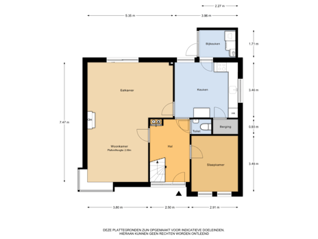 Begane grond: entree/ hal - trapopgang - woonkamer - dichte keuken met provisiekast - bijkeuken met wasmachine- en drogeropstelling - toilet met fonteintje - slaap-/ werkkamer.