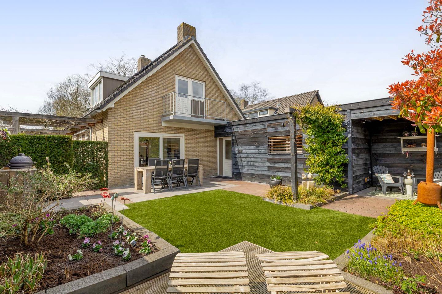 De tuin rondom de woning is met zorg en gevoel voor detail aangelegd en heeft een speels, uitnodigend karakter. Verspreid over de tuin liggen meerdere terrassen met gezellige zitplekken, zowel naast als achter het huis, waardoor je op elk moment van de dag een fijn plekje in de zon of juist in de schaduw kunt vinden. Sierlijke bestrating, stijlvolle keramische tegels, grind en kunstgras wisselen elkaar harmonieus af. De rijkgevulde borders met diverse beplanting zorgen voor kleur, sfeer en een intieme ambiance. Door het slimme gebruik van pergola's, hagen en bomen geniet je hier bovendien van een prettige mate van privacy.