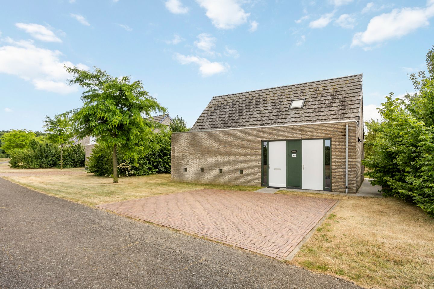 Achter de bescheiden voorgevel ontvouwt zich een royaal, luxe en licht vakantiehuis van topkwaliteit. Aan de voorzijde zijnde voordeur naar de hal en een deur naar de berging, die ruimte biedt aan de fietsen. De hal is, net als de rest van de recreatiewoning, smaakvol verbouwd.