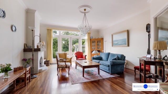 Begane grond: entree, royale met garderoberuimte en toegang naar inpandige berging (voormalige garage), stook-/provisiekelder, ruime woonkamer ensuite met parketvloer, open haard en openslaande deuren naar de achtertuin, brede keuken met inbouwapparatuur;