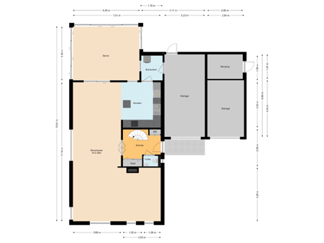 Zij-entree, royale hal met trap, vide, meterkast, garderobekast, toiletruimte met wandcloset en fonteintje, openslaande (glas)deuren naar de L-vormige woonkamer (55 m2), open keuken in hoekopstelling geplaatst met granieten werkblad en inbouwapparatuur (2010), in 2004 aangebouwde serre met schuifdak en zonwering, bijkeuken met aansluitend de eerste garage (afmeting circa 3,23 meter breed x circa 6,60 meter diep); de opstelling van de cv-installatie/warmtepomp bevindt zich in deze garage. Aangebouwde (carport)garage (afmeting circa 2,94 breed x 4,54 meter diep) en tuinberging. De begane grond is grotendeels afgewerkt met een marmeren en granieten vloer.