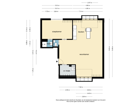 De slaapkamer ligt rustig aan de achterzijde van het appartement en biedt voldoende ruimte voor een tweepersoonsbed en kast. De badkamer is compact maar efficiënt ingericht, met een douche en wastafel. De aparte toiletruimte is bereikbaar vanuit de woonkamer. In de interne berging/technische ruimte is plaats voor extra opslag en de wasmachine/droger.