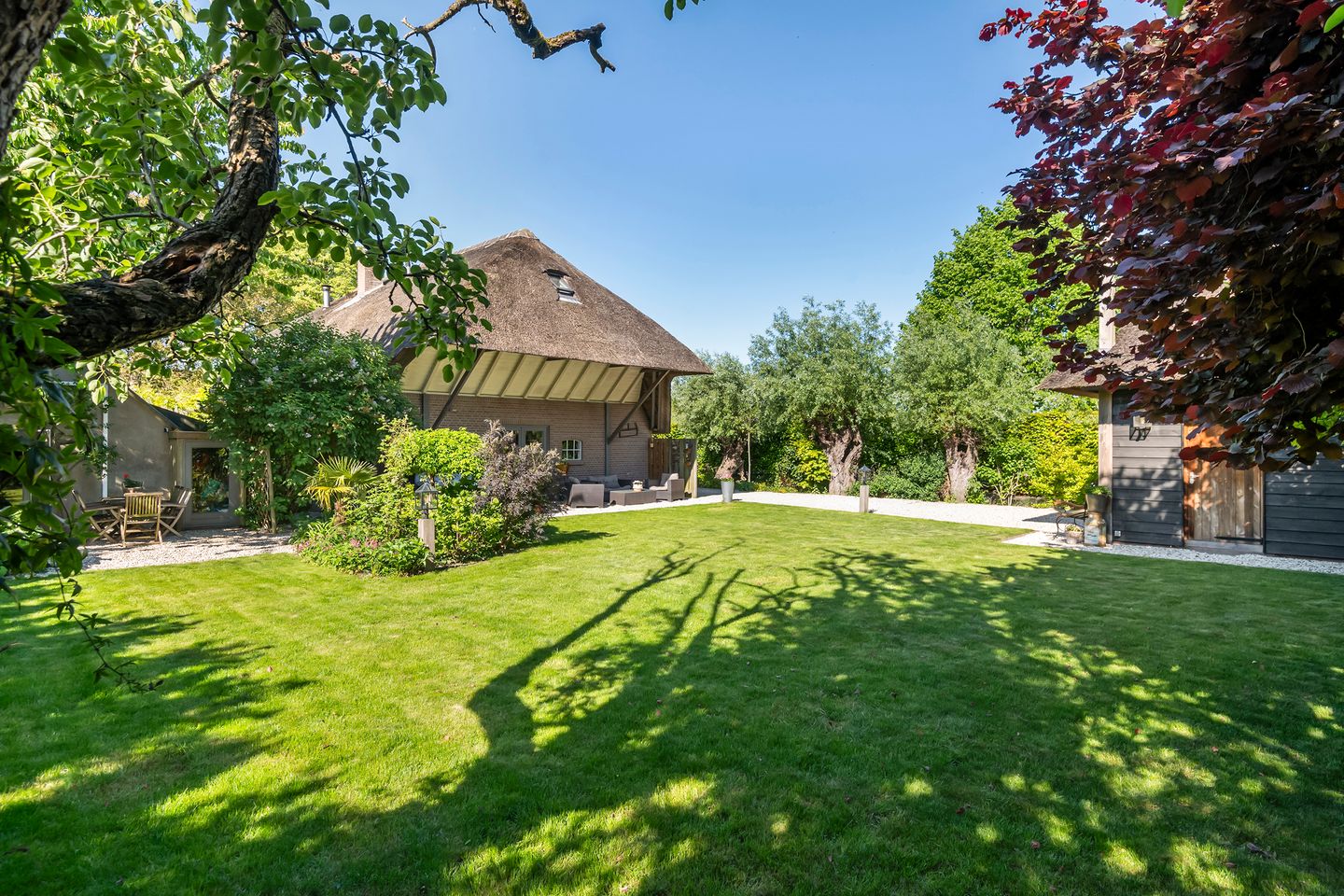 In je eigen achtertuin staan authentieke Betuwse hoogstambomen: kersen, noten, appels en knotwilgen, alsof de tijd hier stil is blijven staan. Terwijl je op je terras geniet van een kop koffie, groeten de kikkers in je eigen sloot je zachtjes, verlicht door op afstand bedienbare tuinverlichting die je tuin ’s avonds in een sprookjesachtige sfeer hult.