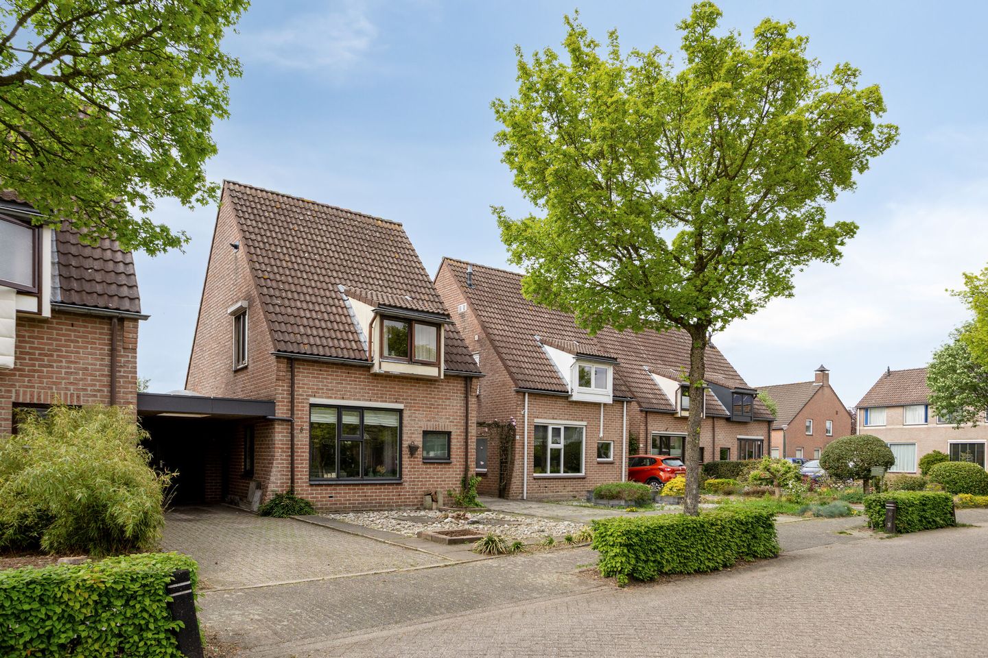 Aan de voorzijde is de eigen oprit en carport aanwezig.