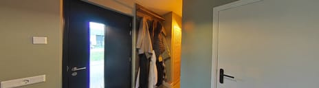 Je komt binnen in de ruime entree/hal met meterkast (10 groepen, 2 fase groep , 3 aardlekschakelaars en glasvezelaansluiting), de praktische kelderkast, toiletruimte en de trapopgang naar de eerste verdieping.