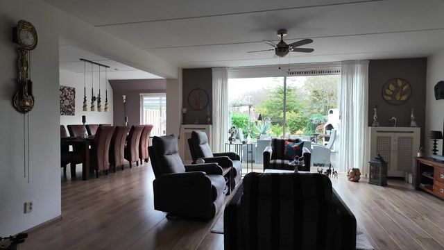 Bij binnenkomst komt u in de ruime hal met trapopgang, meterkast en een nette toiletruimte met wandcloset en fonteintje. Vanuit de hal is er toegang tot de inpandige garage, die is voorzien van elektriciteit en een deur naar de oprit, praktisch voor extra opslag of als hobbyruimte. Via de deur met glas-in-lood bereikt u de ruime woonkamer, die direct opvalt door het vele daglicht, de openhaard en het vrije uitzicht aan de achterzijde. De woonkamer loopt over in de eetkamer aan de zijkant, waar de tuindeur toegang geeft tot de royale achtertuin. Aan de voorzijde van de woning bevindt zich de open keuken. Deze is perfect onderhouden en voorzien van een granieten werkblad, een 5-pits kookplaat met afzuiging, een vaatwasser, combimagnetron, koelkast en vriezer. Er heerst een warme en fijn sfeer. De gehele beneden verdieping is voorzien van laminaatvloer.