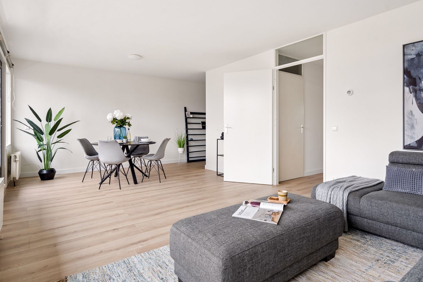 De woonkamer is ruim, licht en perfect in balans. Grote raampartijen zorgen voor een zee aan daglicht en geven de ruimte een open, uitnodigend karakter. Hier creëer je moeiteloos een royale zithoek én een sfeervolle eethoek, dé plek voor gezelligheid.