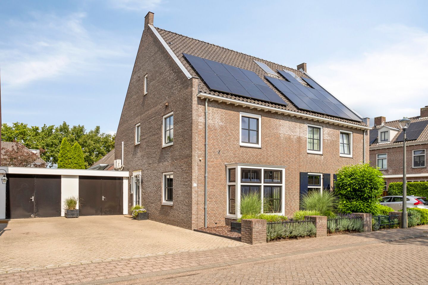 Je komt aan via een diepe oprit met ruimte voor meerdere auto’s. De voortuin is netjes aangelegd en volledig omheind.