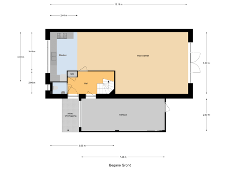 Hal met meterkast en toegang tot toilet, meterkast, woonkamer en garage. Woonkamer met open keuken voorzien van inductieplaat, afzuigkap, vaatwasser, granito werkblad, Quooker en koel/vriescombinatie. Verlengde woonkamer met tuindeuren naar de tuin. Verlengde garage heeft toegang naar de hal en tuin.