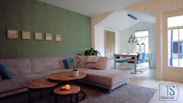 Lichte en sfeervolle woonkamer dankzij de aanbouw aan de achterzijde. Aan de voorzijde bevindt zich de zithoek met een praktische trapkast voor extra bergruimte. In de aanbouw is het eetgedeelte gesitueerd. Via de openslaande deuren is er direct toegang tot de achtertuin.