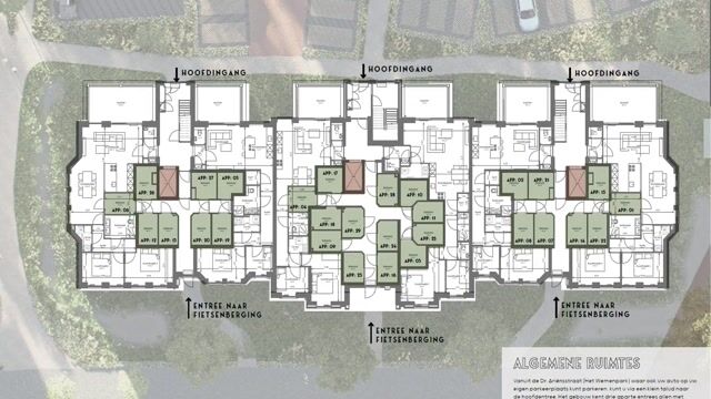 * Het appartementencomplex kent drie aparte hoofdentrees (vanuit de Dr. Ariënsstraat) allen voorzien van een gesloten entree met intercominstallatie, postbussen, een lift en trappenhuis.